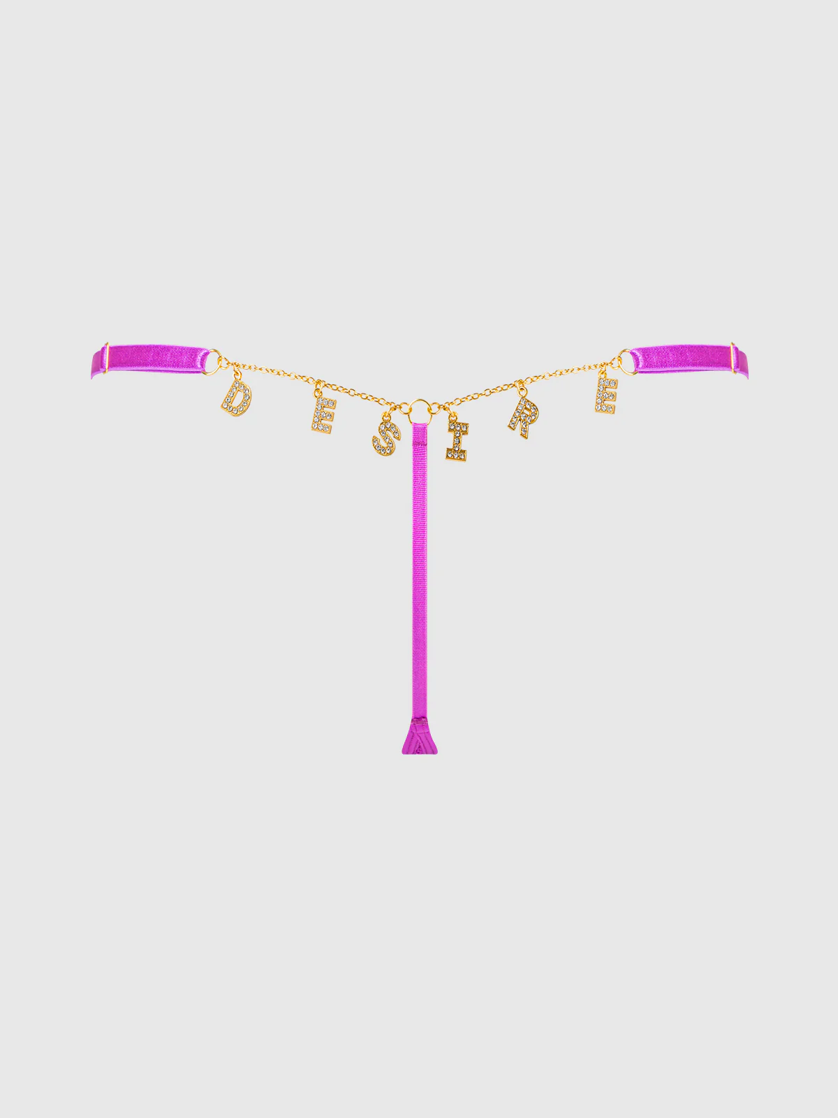 A daring dalliance with D-E-S-I-R-E! The Reanna charm G-string awaits your favor. It’s feminine, flirty, exquisite, and fun! Crafted in fine eyelash lace and adorned with rhinestone letter charms that flirtatiously dangle on your bottom. Delicate, daring, and delightful; this barely-there panty is the perfect choice for when you want to make your intentions crystal clear.