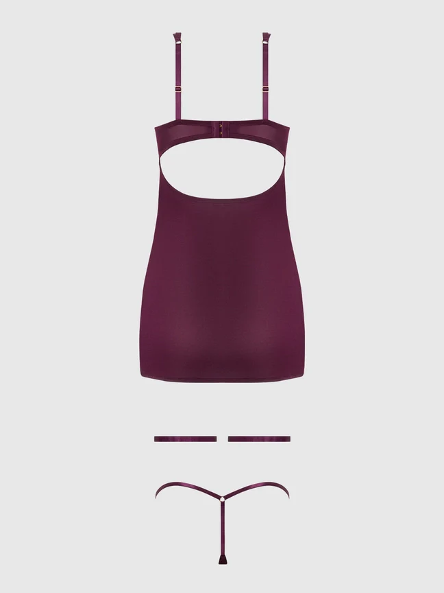Unleash your inner provocateur with the Shimmer Mesh O-Ring Thigh Garter Chemise Set and get ready for passionate play. Its body-hugging fit sculpts your figure while barely there, underwired cups lifts with ease. Finished with perfectly placed rhinestone O-rings for a sensual peek-a-boo effect and flirty thigh garters. Sheer g-string panty amps up the heat with skin-baring allure.