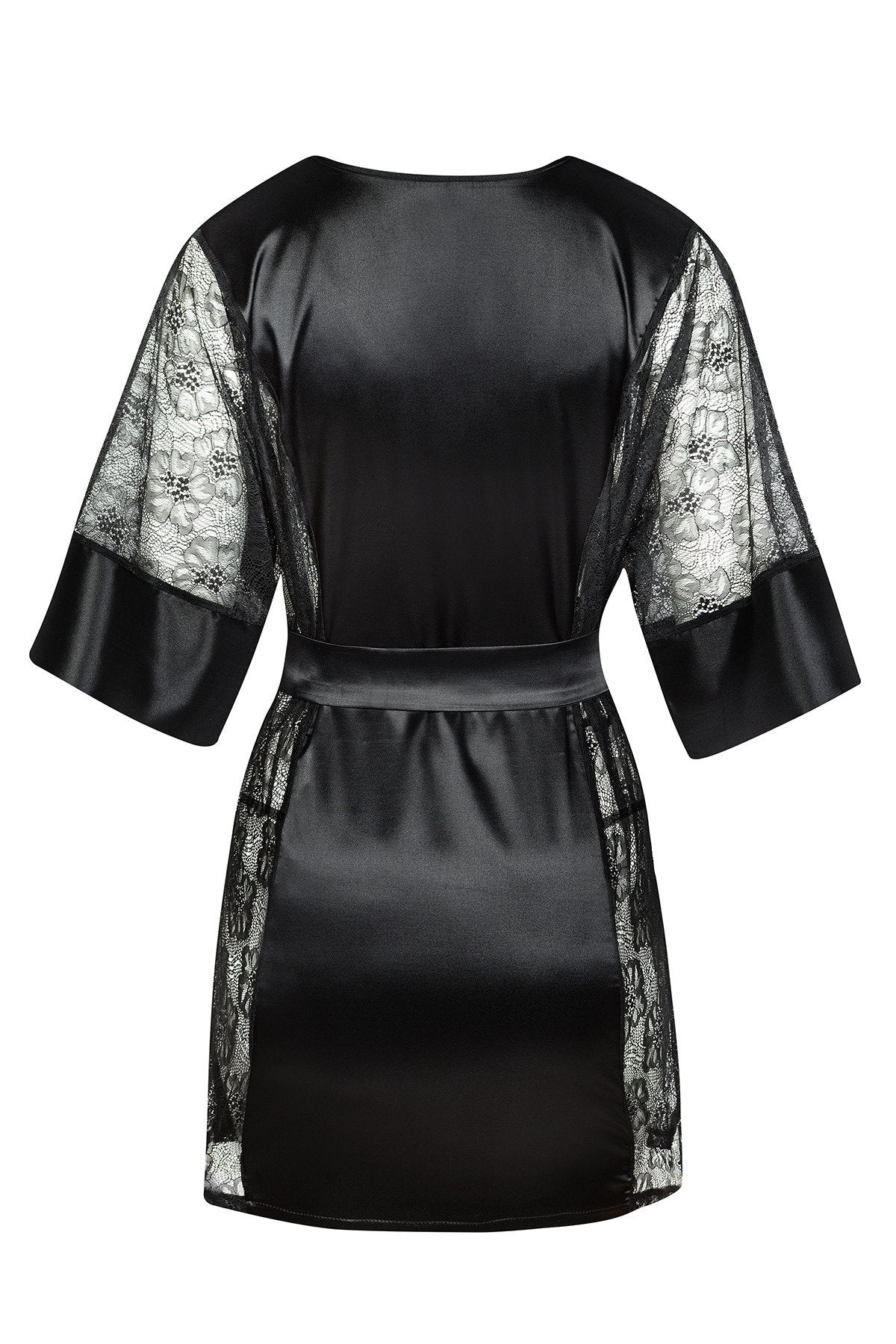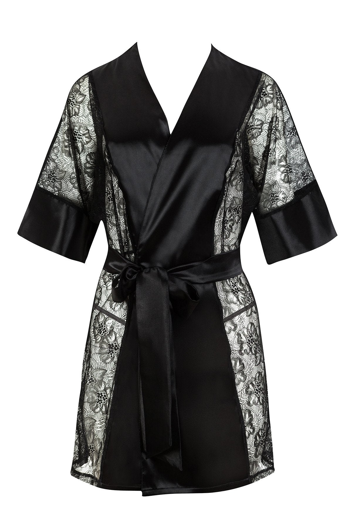 An exclusive and extremely sexy satin dressing gown that is tied at the waist. This design is made from shiny satin which is combined with beautiful lace that can be found on the sleeves and sides of the dressing gown.