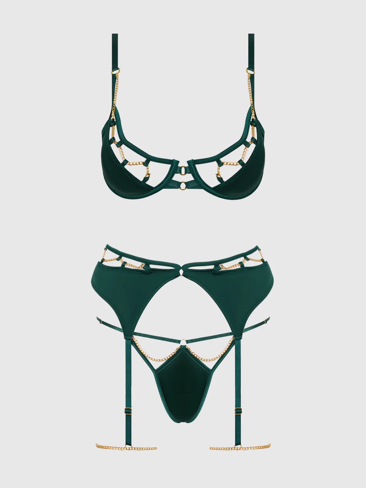 Slip on the Emerald Satin & Chain Push Up Bra, Thigh Garter Belt & G-String and elevate the rules of seduction. This three-piece power set frames the figure with bold lines, featuring a wired demi cup bra and v-front thong that commands attention. Finished with matching garter belt with chain thigh straps for an extra layer of fierceness.