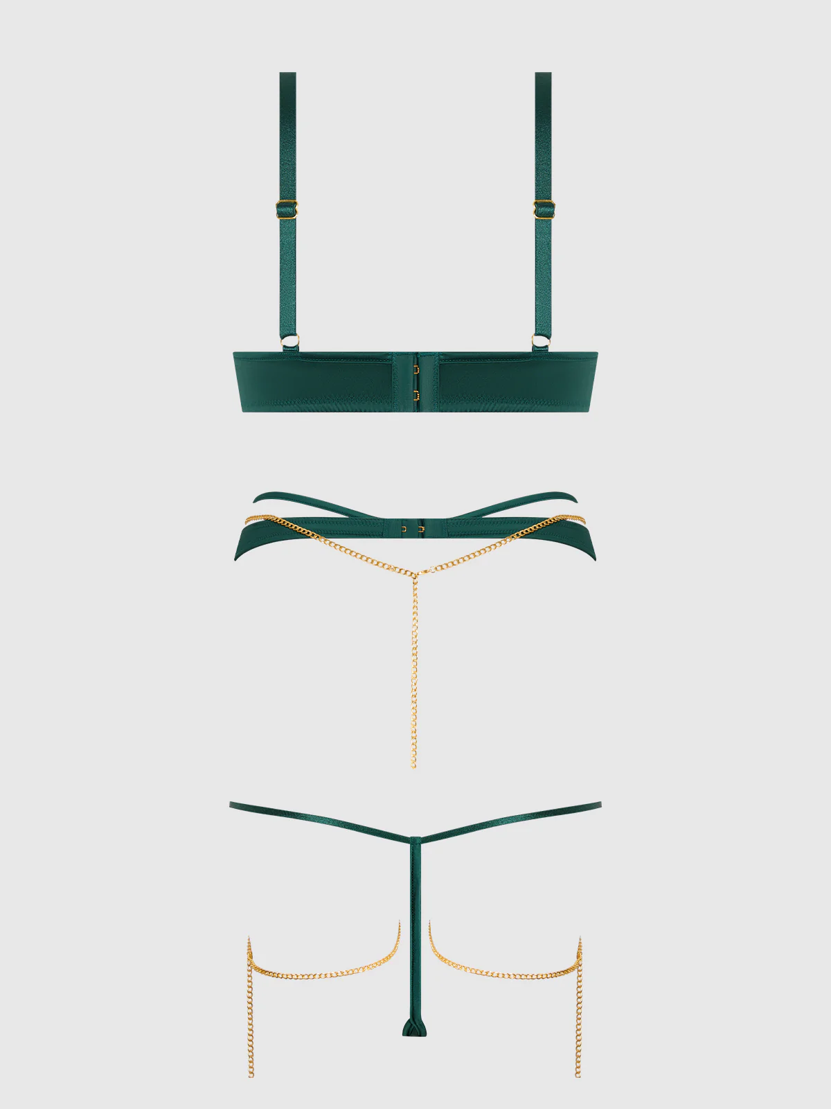 Luxurious Emerald Satin & Chain Push Up Bra, Thigh Garter Belt & G-String